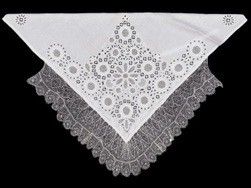 Smuteční plena z bílého bavlněného batistu, vyšívaná bílou bavlněnou přízí. Plocha zcela zaplněna. V cípu osmilistý květ, kolem kulaté květy a jablka. Středy všech květů jednoduše mřížkovány. Mezi květy malé kulaté prolamované motivy s kosočtverci uprostřed. Krajka paličkovaná vláčková tvz. strážovská. Techniky výšivky: plný plochý steh, plný steh, mřížky, pavoučci (výplně vyšité lněnou přízí), dírky. Míry: 100 cm x 100 cm plátno, 17 cm krajka. Práce novější, není vyloučeno, že pochází z "umělecké pracovny", která po I. světové válce fungovala při České jednotě paní a dívek v Plzni (upozornila sl. M. Lábková).