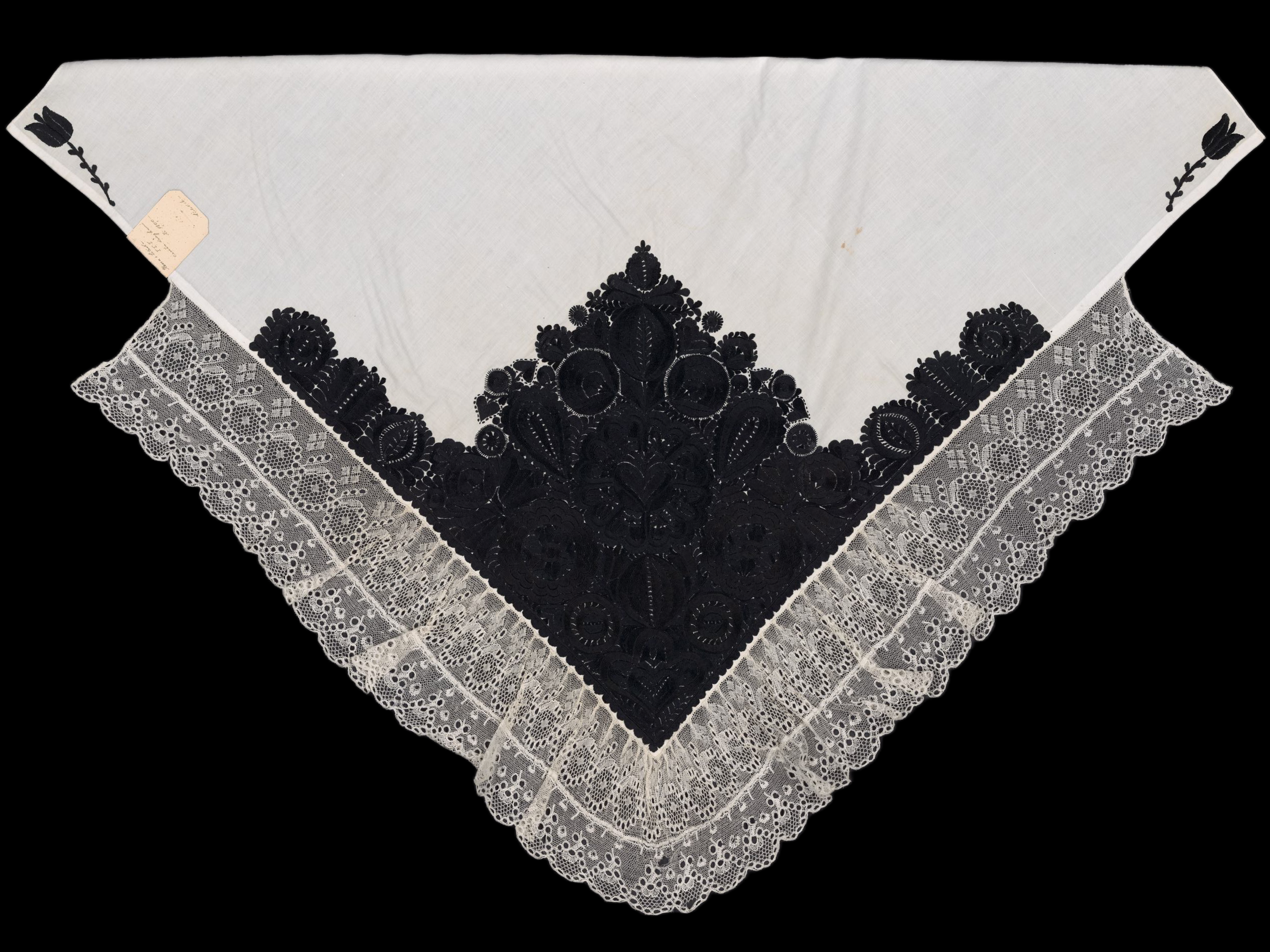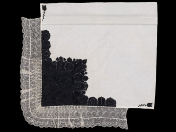 Plena z bílého bavlněného batistu, vyšívaná černou hedvábnou přízí. Plocha zcela zaplněna. V cípu srdce, z něj vyrůstá granátové jablko a veliký květ se srdcem ve středu, kolem velké květy kulaté a esovité zvonky. Krajka paličkovaná vláčková tvz. strážovská. Techniky výšivky: plný steh, stonkový steh, smykovací steh, vyšívané mřížky. Míry: 84 cm x 82 cm plátno.