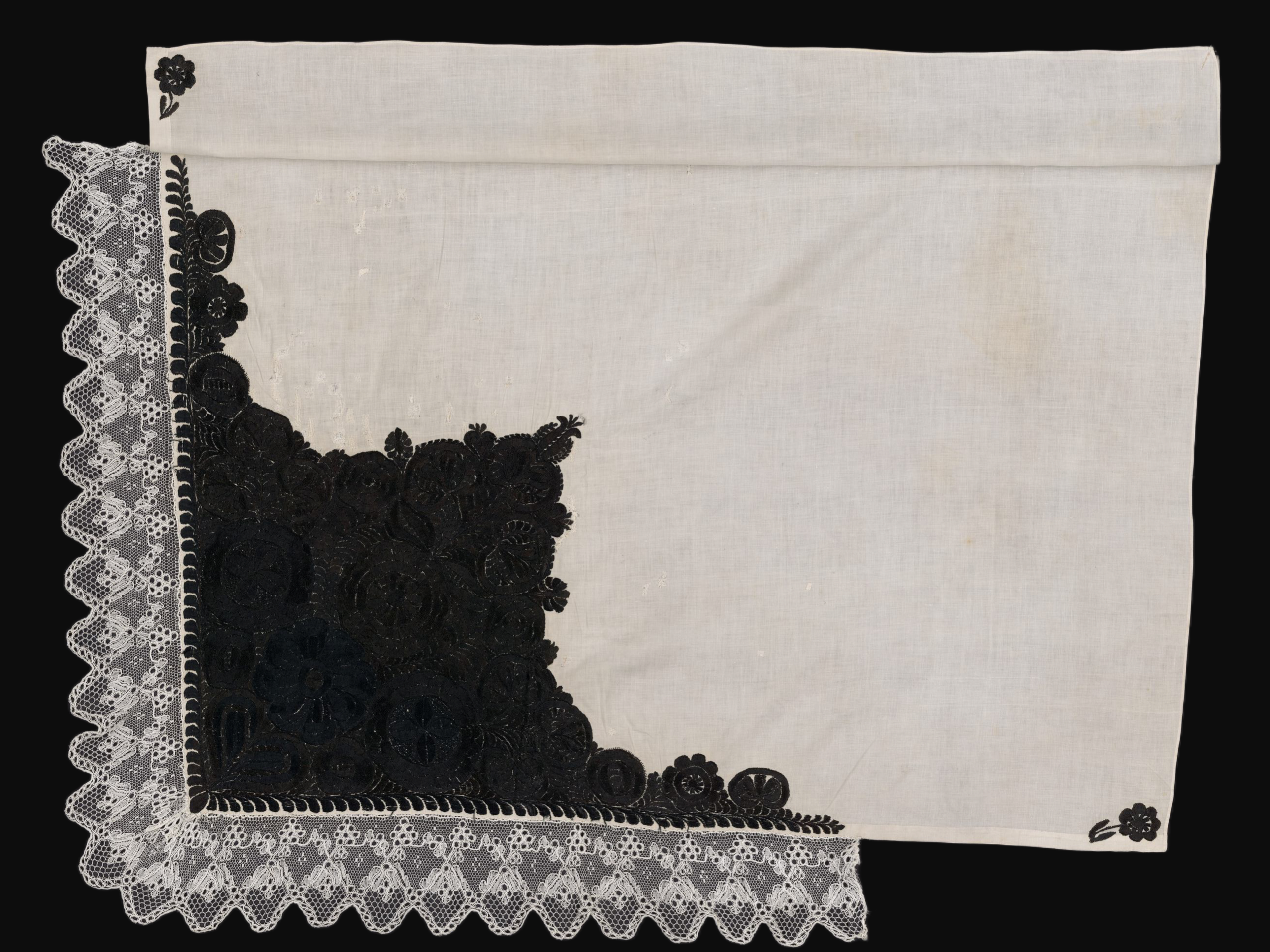 Plena z bílého bavlněného batistu, vyšívaná černou hedvábnou přízí. Plocha zcela zaplněna. V cípu velké srdce, z něj vyrůstají dva veliké květy nad sebou, po stranách dvojice květů se čtyřmi lístky ve středech, kolem jablíčka. Krajka paličkovaná vláčková tvz. strážovská. Techniky výšivky: plný plochý steh, plný steh, stonkový steh, vyšívané mřížky. Míry: 98 cm x 92 cm plátno, 10 cm krajka.