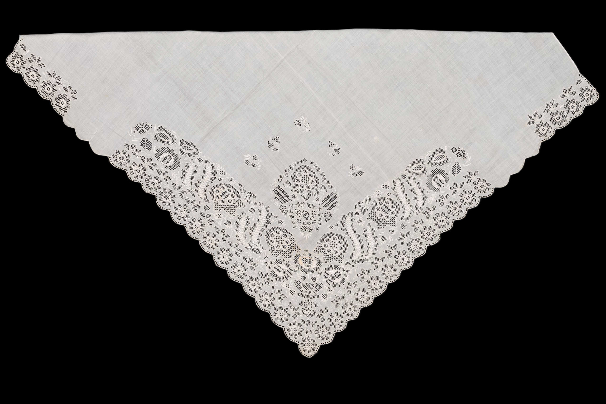 Plena z Plzeňska z bavlněného plátna, vyšívaná bílou bavlněnou nití. Techniky vyšívání: dírkové vyšívání v krajích; plné vyšívání, stonkový steh u větviček, mřížky v ploše stahované, mřížky v ploše vytahované.