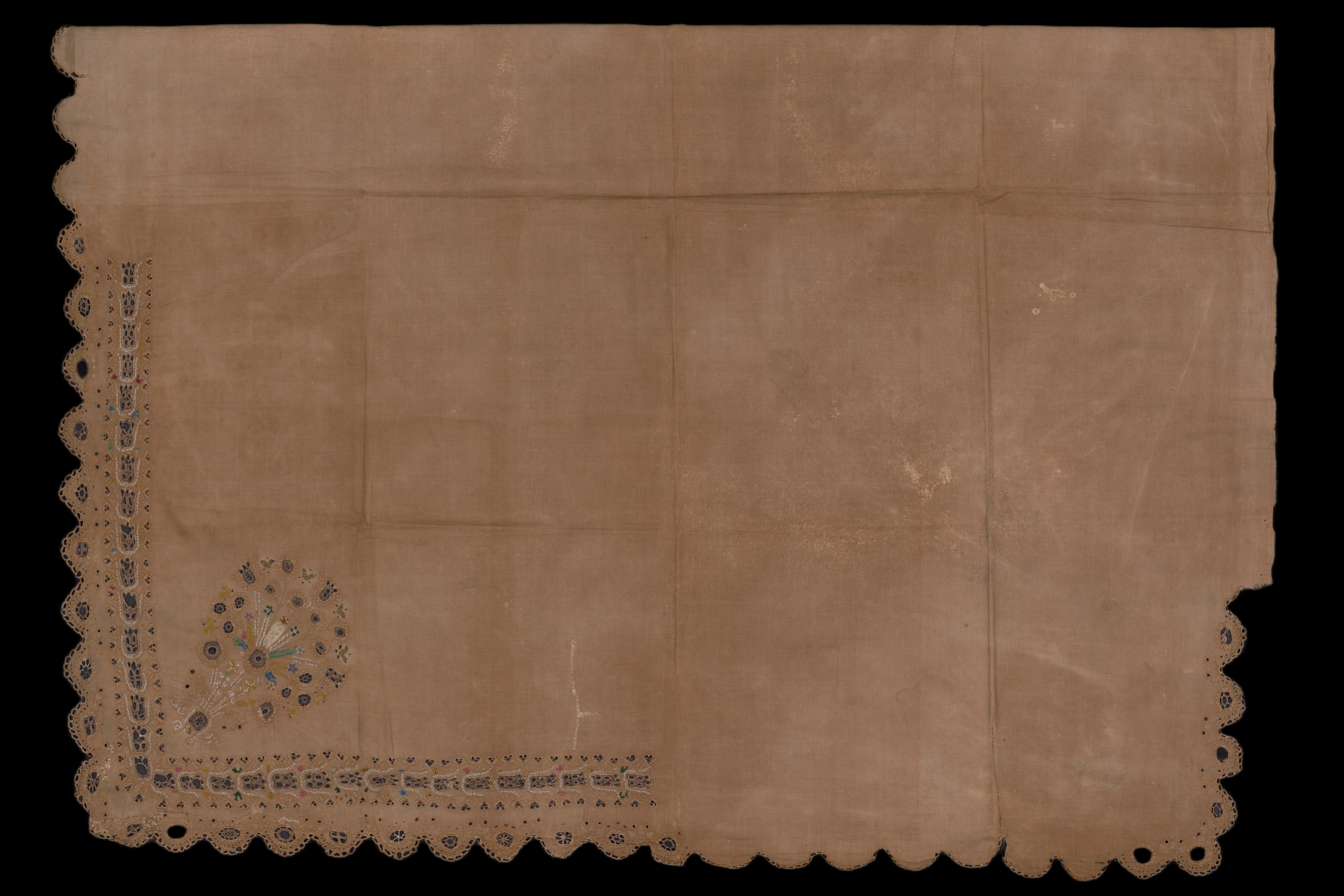 Plena z bavlněného plátna vyšitá barevnými korálky, obarvená na hnědo. Vprostřed cípu florální motiv, pod ním monogram. Po stranách kulaté cípky. Vyšívala pro svoji sestru Hušková Terezie cca roku 1850 v Pernarcích (hejtmanství Stříbro), narozená cca 1830. Získána 12.12.1926 od Mary Langmajerové v Touškově do sbírky Marie Lábkové.