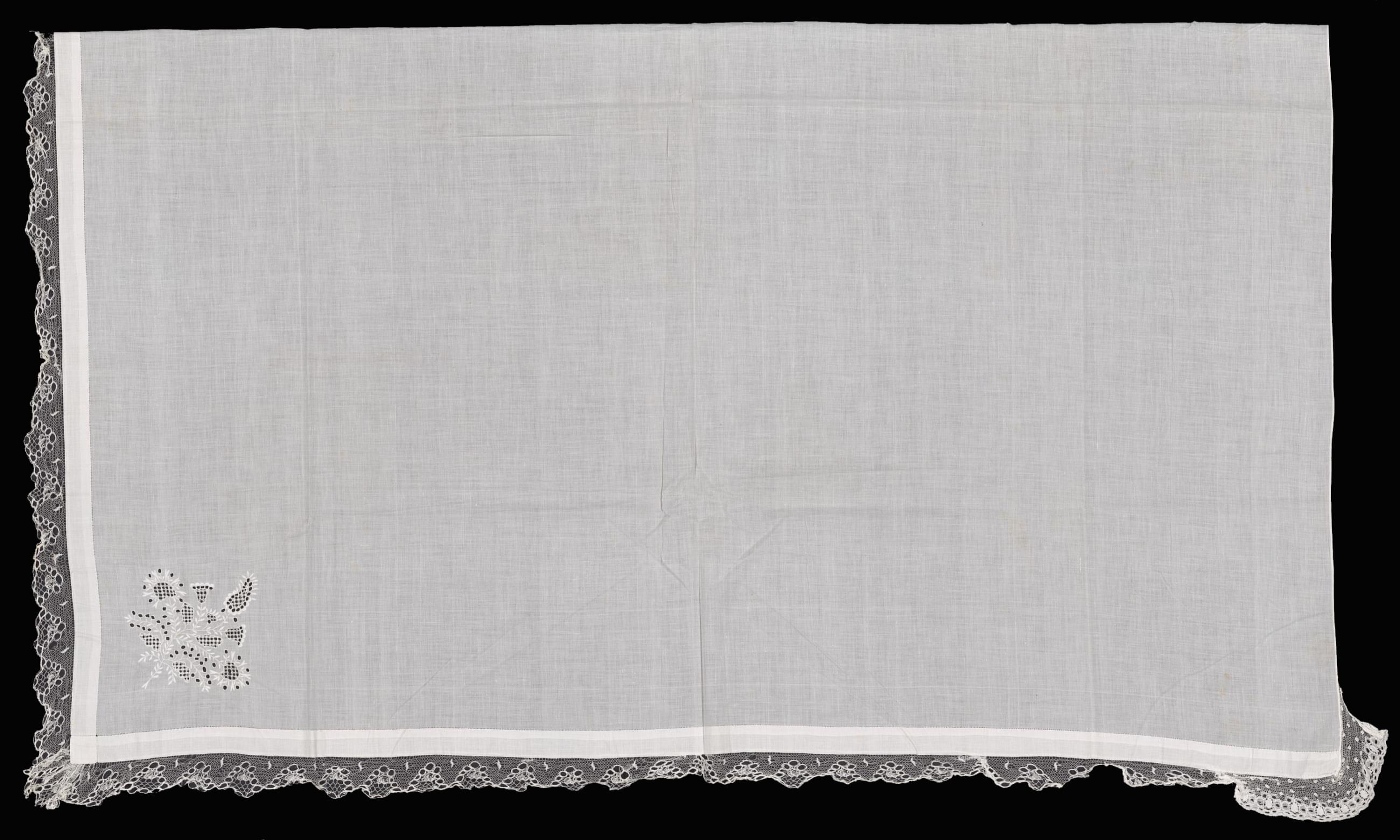 Plena bíle vyšívaná, v rohu malá mřížkovaná kytice, při kraji záložka. Krajka paličkovaná. Získaná do sbírky Marie Lábkové 22.12.1913 od selky, mlynářky ve Žďáru u Blovic. Míry: s.145 cm, d.145 cm.