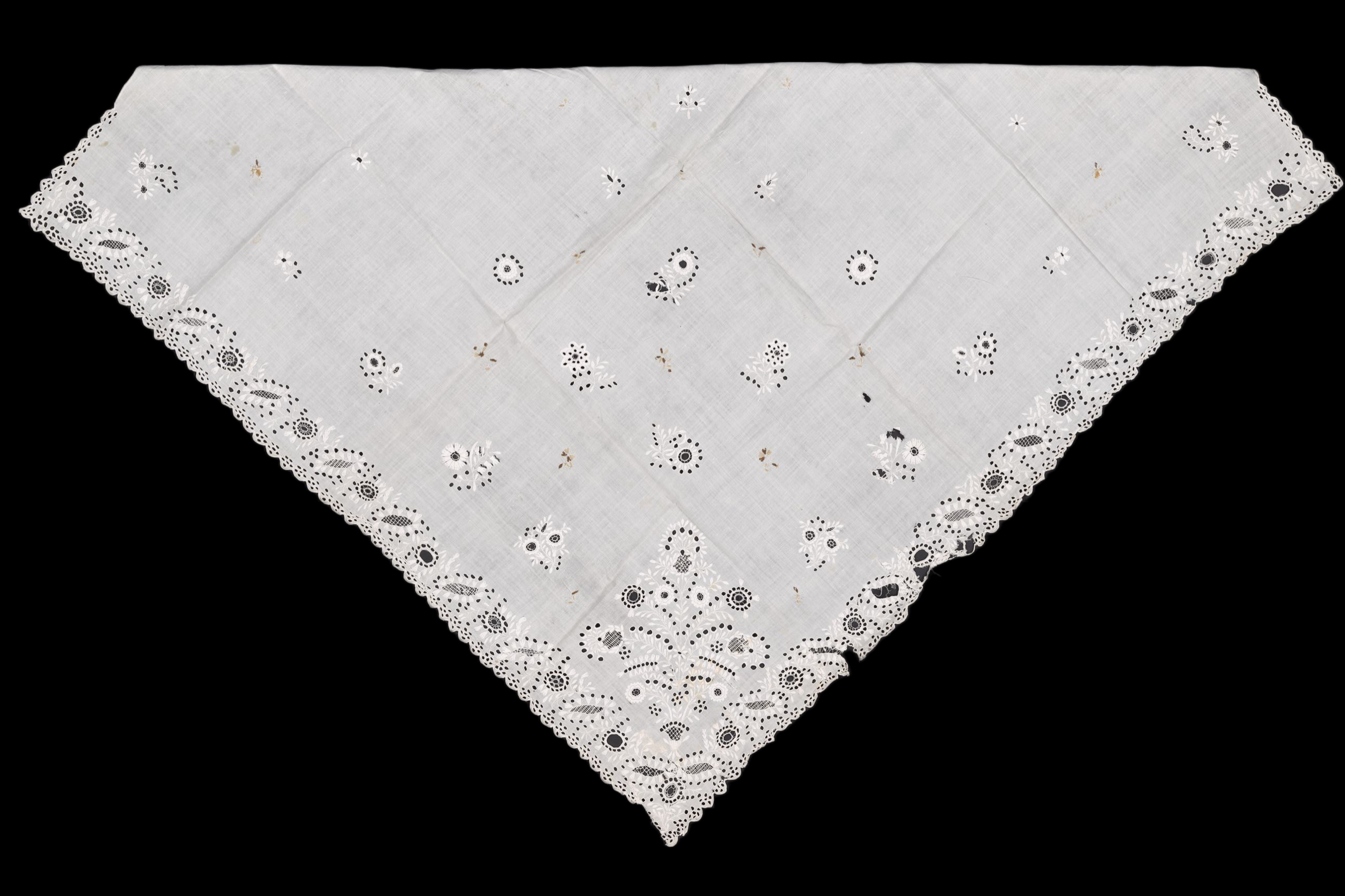 Plena vyšívaná bílou bavlnkou s růžicovým a šípkovým ornamentem s okolním pásem 6 cm širokým, vyšitým po obou stranách s drobnými cípky. Mezi nimi drobné kvítečky z dracounu, degradované, část chybí. Původ vzniku snad z Dobřanska. Míry: s.97 cm, d.93 cm