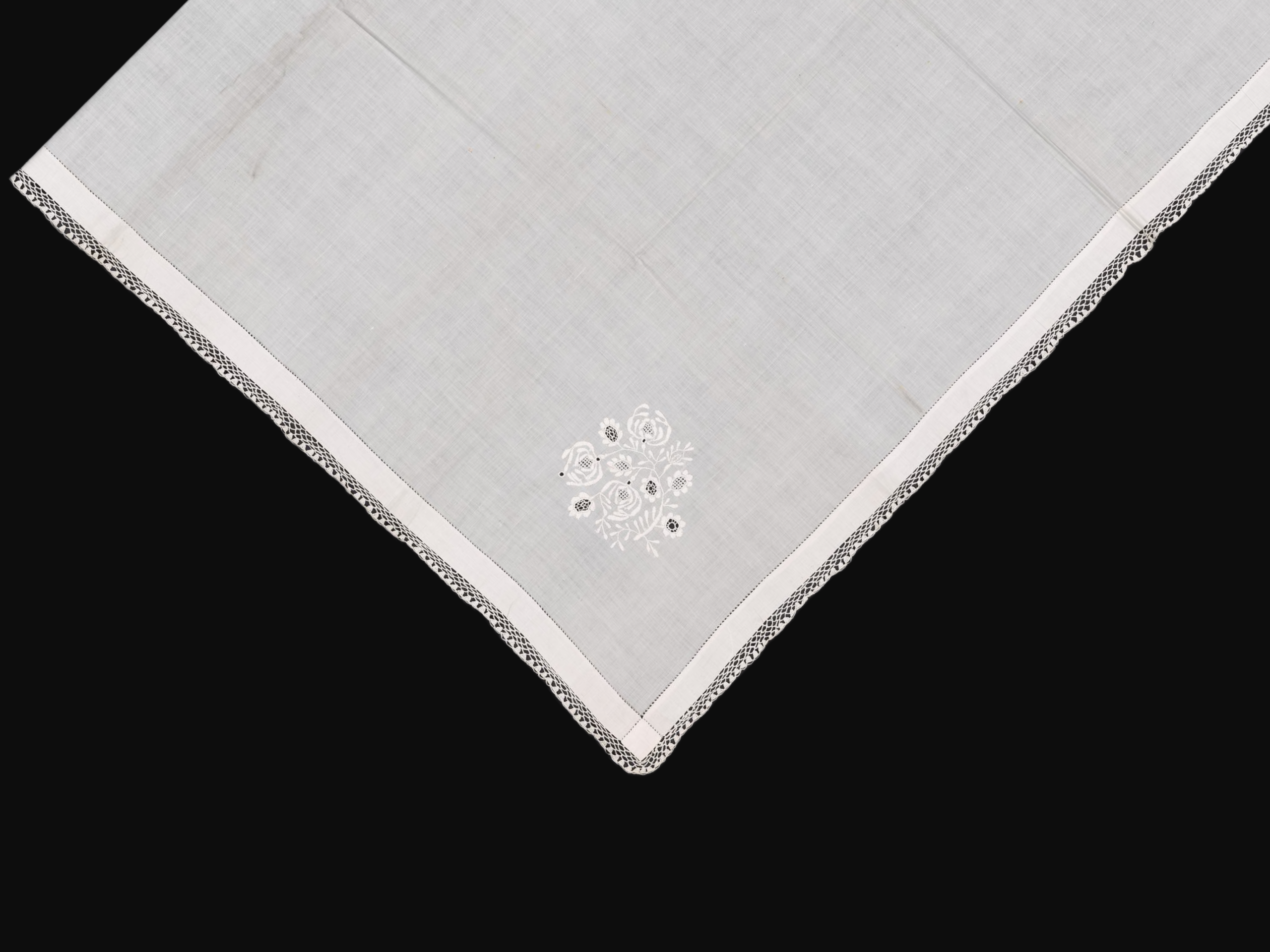 Plena z bílého jemného plátna s hrubší bílou výšivkou v rohu, středy květů mřížkové. U obruby ažura, háčkovaná krajka. Získáno od paní Brožové 6. 6. 1917, která plenu nosila. Míry: d.135 cm, s.138 cm