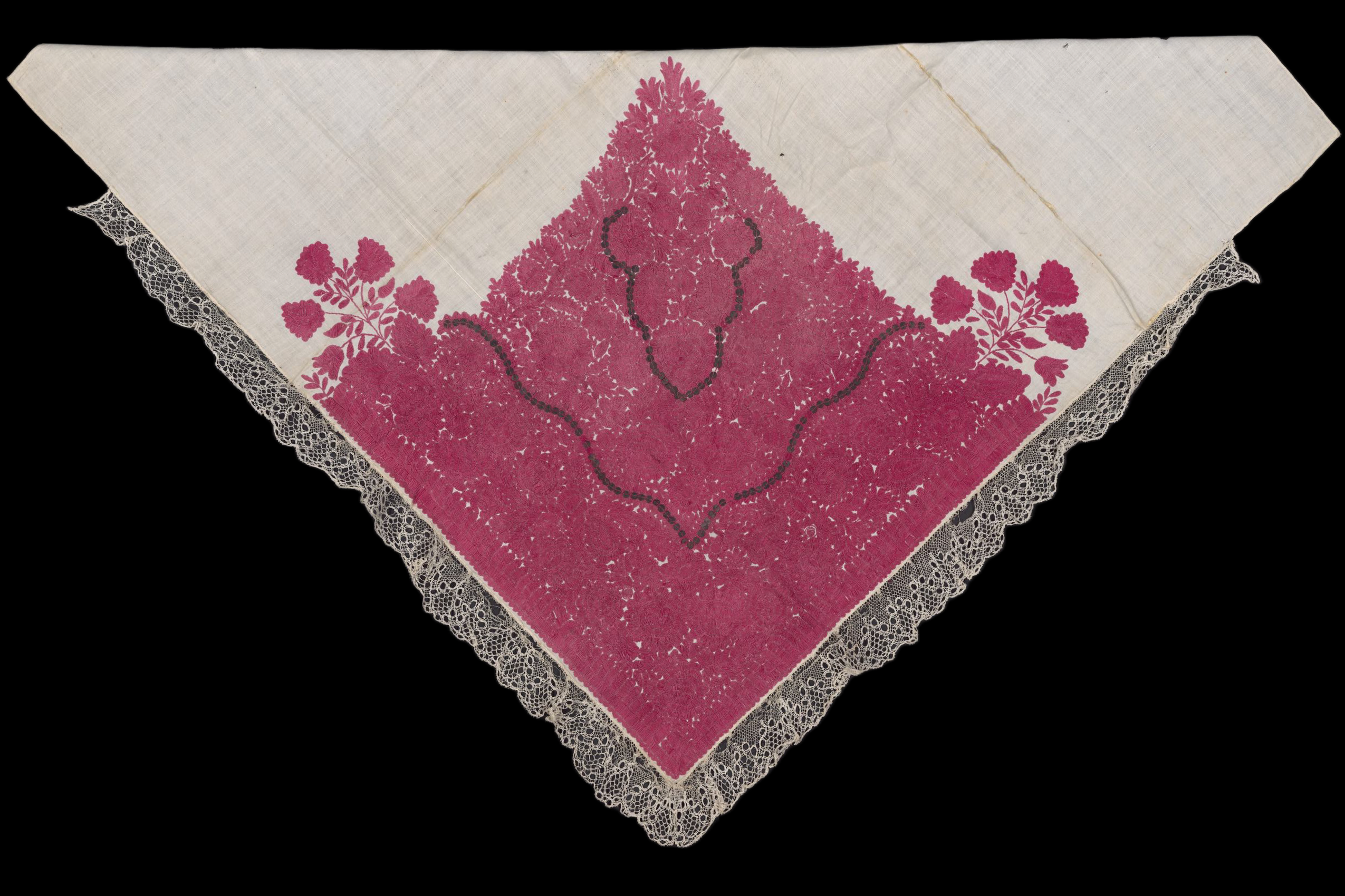 Plena z bílého bavlněného batistu, vyšívaná karmazínovou hedvábnou přízí. Krajka paličkovaná vláčková tvz. strážovská. Techniky výšivky: plný plochý steh, plochý steh. Míry: 84 cm x 84 cm plátno.