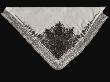 Plena z bílého bavlněného batistu, vyšívaná černou hedvábnou přízí. Plocha zcela zaplněna. V cípu tři květy tvaru růžových poupat. Krajka paličkovaná vláčková tvz. strážovská. Techniky výšivky: plný plochý steh, plochý steh, stonkový steh. Míry: 79 cm x 79 cm plátno, 9 cm krajka.