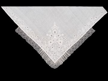 Smuteční plena z bílého bavlněného batistu, vyšívaná bílou bavlněnou přízí. Vzor s kyticí situovanou ve středu, při kraji vodorovná větvička s květy. Květy prolamované a mřížkované. Krajka paličkovaná vláčková tvz. strážovská. Techniky výšivky: plný plochý steh, plochý steh, řetízkový steh, dírky. Míry: 101 cm x 96 cm plátno, 7 cm krajka.
