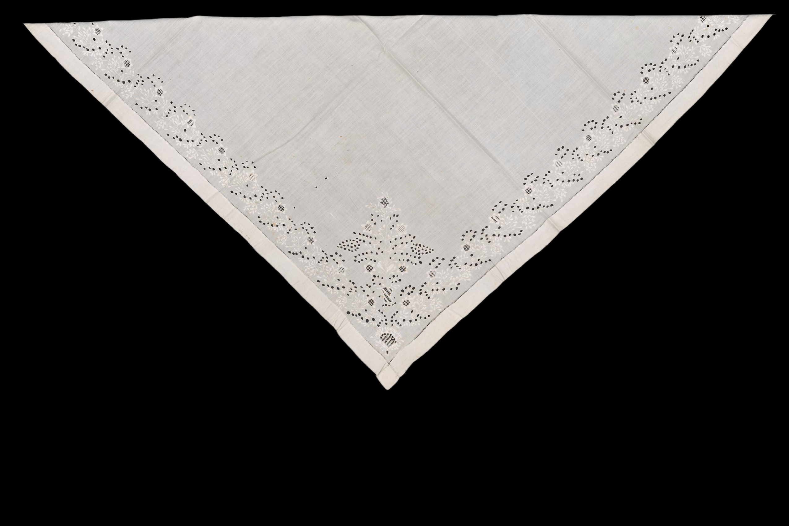 Plena z bílého jemného plátna po dvou sbíhajících se stranách bíle vyšita. U krajů širší lemovka oddělená ažurkou. Do muzea získáno r. 1958. Míry: s.141 cm, d.157 cm
