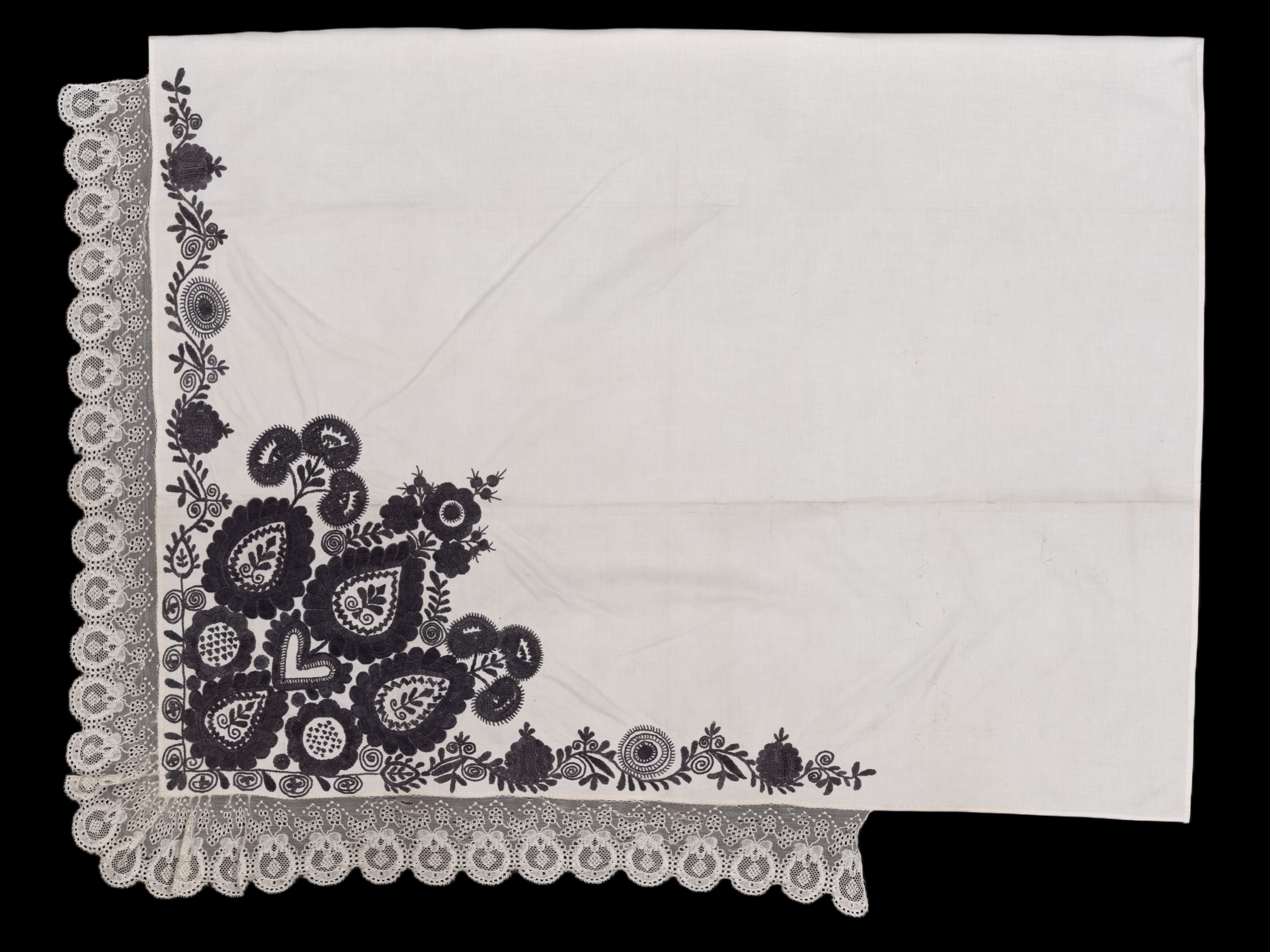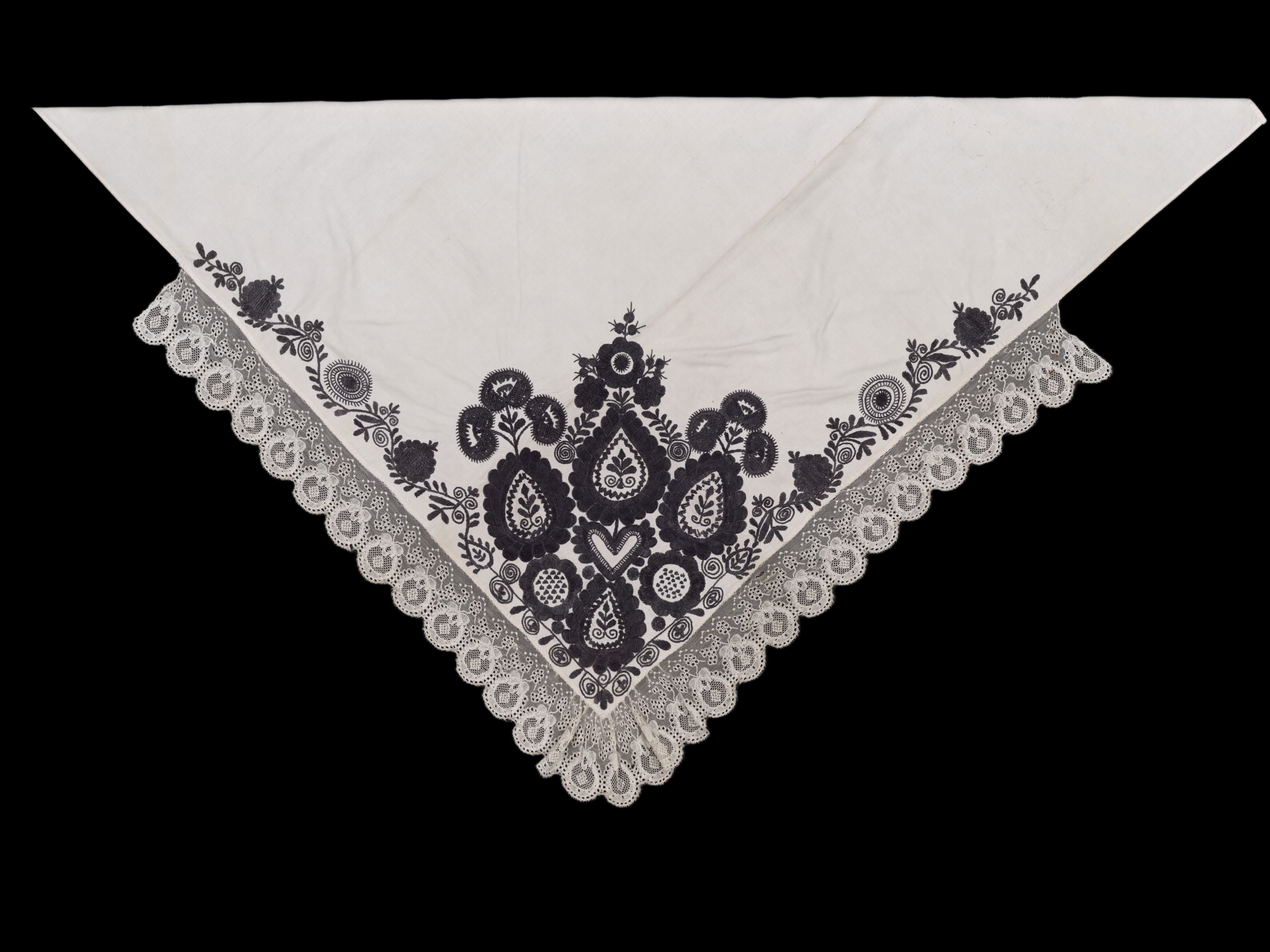 Plena z bílého bavlněného batistu, vyšívaná černou hedvábnou přízí. Plocha zcela zaplněna. V cípu čtyři veliká poupata s větvičkami ve středních plochách, uprostřed srdce, kolem 2 kulaté květy s puntíkovanými prostředky a dvě trojice granátových jablíček. Krajka paličkovaná vláčková tvz. strážovská. Techniky výšivky: plný plochý steh, plochý steh, stonkový steh, smykovací steh, vyšívané mřížky. Míry: 105 cm x 115 cm plátno, 10 cm krajka. Práce novější, není vyloučeno, že pochází z "umělecké pracovny", která po I. světové válce fungovala při České jednotě paní a dívek v Plzni (upozornila sl. M. Lábková).