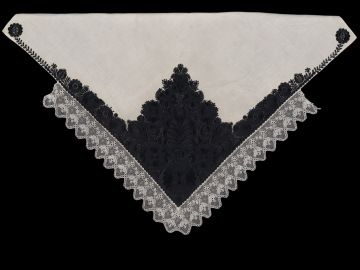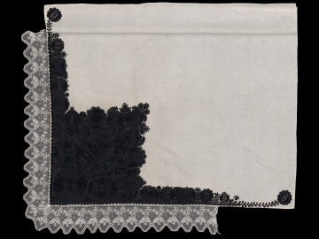 Plena z bílého bavlněného batistu, vyšívaná černou hedvábnou přízí. Plocha zcela zaplněna. V cípu kulatý květ s hvězdicí uprostřed, z něho vyrůstají dvě srdce a palmeta, kolem seskupeny velké květy a jablíčka. Krajka paličkovaná vláčková tvz. strážovská. Techniky výšivky: plný plochý steh, stonkový steh, vyšívané mřížky. Míry: 99 cm x 101 cm plátno, 11 cm krajka.