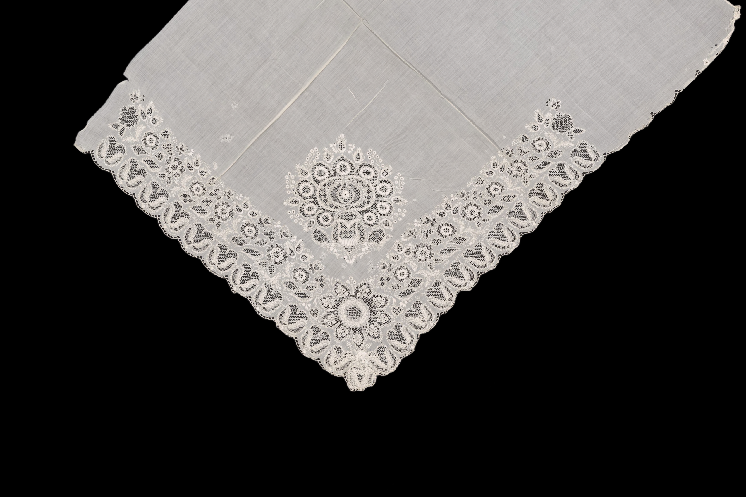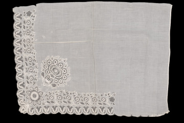 Fragment pleny z Plzeňska z bavlněného mušelínu. Část plátna odtržena, místy látáno. Na konci zoubků (okrajové oblouky) kroužkování. Techniky vyšívání: dírkové vyšívání v krajích, zakončené smykovacím stehem. Florální motivy zhotoveny plnou výšivkou. Stonkový steh u větviček. Mřížky v ploše stahované, mřížky v ploše vytahované.