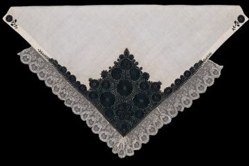 Plena z bílého bavlněného batistu, vyšívaná černou hedvábnou přízí. Plocha zcela zaplněna. Kraje výšivky z větvičky s lístky, plocha vyplněna kruhovitými stylizovanými květy, spojenými větvičkami a kruhy. Ve dvou protilehlých rozích kruhovité květy se stonky a lístky. Krajka paličkovaná vláčková tvz. strážovská. Techniky výšivky: plný steh, stonkový, smykovací steh. Míry: 102 cm x 96 cm plátno, 10 cm krajka.