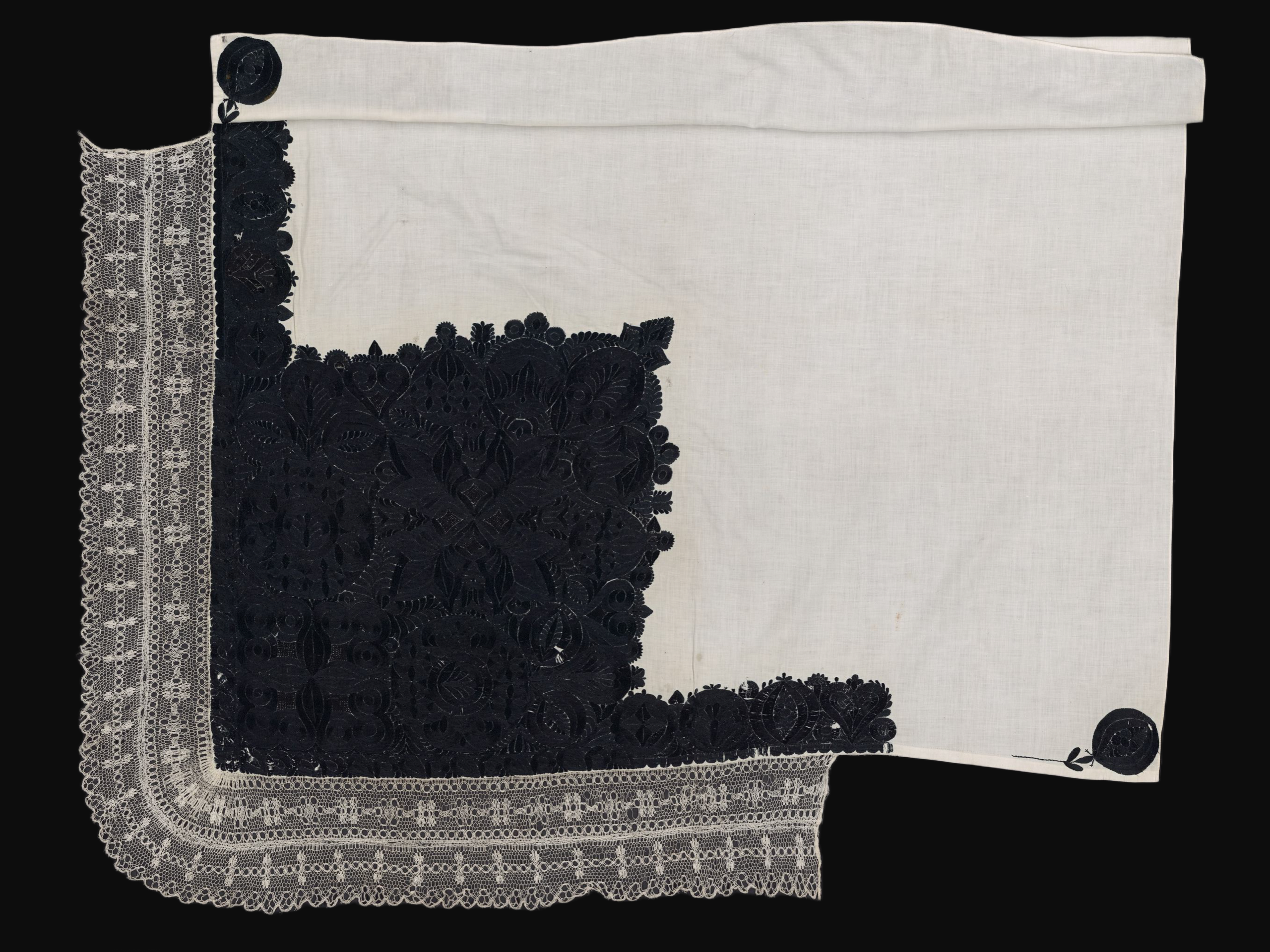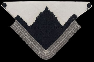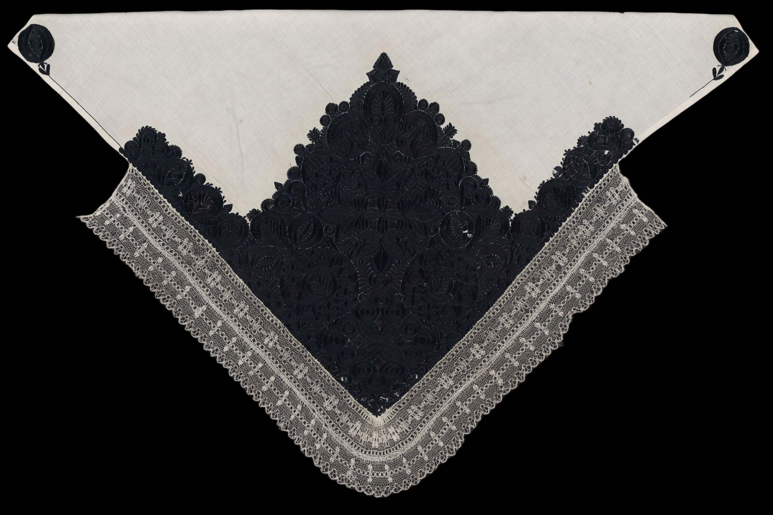 Plena z bílého bavlněného batistu, vyšívaná černou hedvábnou přízí. V cípu hustá kytice, v rohu čtyřlist a závitnice, dále dva velké kruhové motivy, mezi nimi složitá hvězdice. Krajka paličkovaná vláčková tvz. strážovská. Techniky výšivky: plný steh, stonkový steh, smykovací steh. Míry: 92 cm x 96 cm plátno, 11,5 cm krajka.