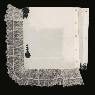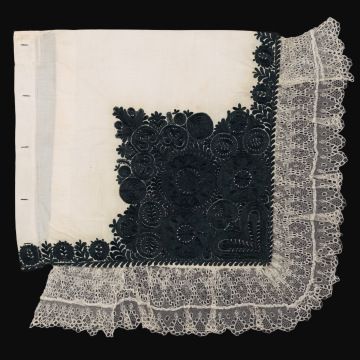 Plena z bílého bavlněného batistu, vyšívaná černou hedvábnou přízí, přešitá na polštářový povlak. V cípu srdce, z něj vyrůstající kulový květ, kolem tři velké květy. Krajka paličkovaná vláčková tvz. strážovská. Techniky výšivky: plný plochý steh, plochý steh. Míry: 65 cm x 60 cm plátno, 14 cm krajka.